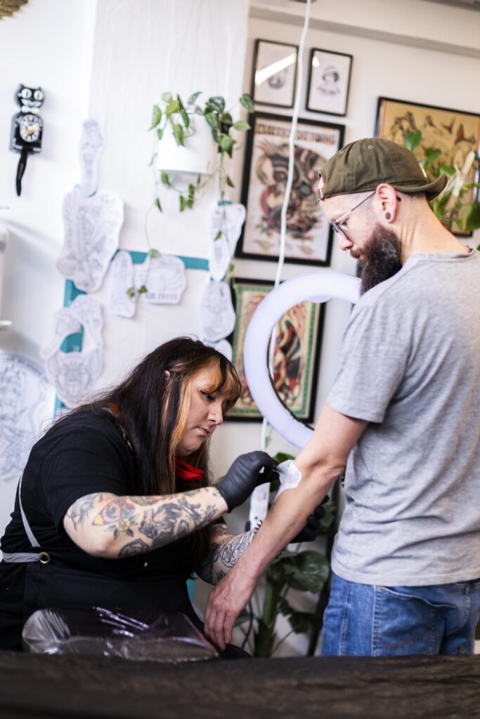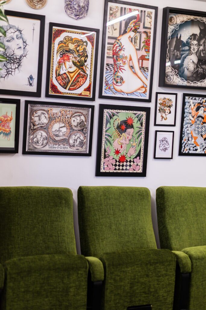 Das Happy Dragon Tattoo Shop ist ein gemütlicher, entspannter und sicherer Raum. Hier tätowieren shy.lary und zitterjenn seit März 2025. Das Studio im ART MAGAZIN im Haus FALK wirkt, als wäre es schon immer hier gewesen, mit Kunst und Couch und ledernen Tätowierstühlen. Die langjährigen Freundinnen sind sich einig: „Wir haben uns in der Tabakfabrik sofort wohl gefühlt, unsere Nachbar:innen haben uns gut aufgenommen.“