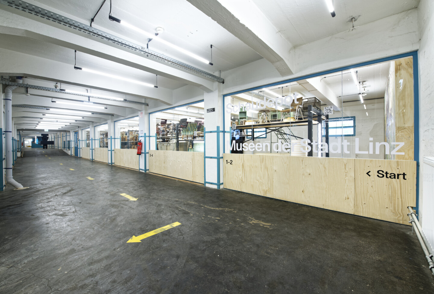 Insgesamt wurden auf 1.800m2 im 1. und 2. Stock Haus FALK dem ehemaligen Tabaklager, 2022 Depoträumlichkeiten für die Museen der Stadt Linz geschaffen. Auf Ebene 1 befindet sich das öffentlich einsichtige Schaudepot. Gerade das Bewahren und Archivieren steht oftmals außerhalb der Wahrnehmung der Öffentlichkeit. Mit dem Schaudepot wird ein Bewusstsein dafür geschaffen, was es bedeutet, die kunst- und kulturgeschichtliche Sammlung der Stadt zu verwalten. Während die Ausstellungen des Stadtmuseums sich neuen Zusammenhängen und stadtgeschichtlichen Vertiefungen widmen, zeigt das öffentlich zugängliche und entlang des „Behrens-Bands“ gelegene Schaudepot die serielle Fülle des Bestands. Anhand von rund 550 Exponaten gewährt es einen exemplarischen Einblick in die Sammlungen der Museen der Stadt Linz und reflektiert die Ordnung des gesamten Depots. Auf 360m2 wird die dichte Vielfalt dieser Sammlungen gezeigt. Möbel, Kunst, Handwerk, Alltag und Industriegeschichte finden sich in modularen Regalen wieder, die den industriellen Charakter des Gebäudes spiegeln. Ein ebenso großes Augenmerk liegt auf der Funktionalität des Depots. Der Speicher des Museums ist laufend im Einsatz, d.h. die Dinge müssen leicht auffindbar und zugänglich sein. So verändert sich das Schaudepot, je nachdem was ergänzt bzw. entnommen wird.